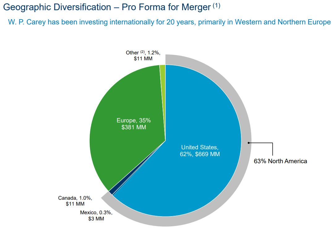 WP Carey a aussi l’avantage d’être un des rares REITS américains à détenir une partie de son parc immobilier en Europe (62% US, 35% Europe) ce qui leur confère une diversification internationale.