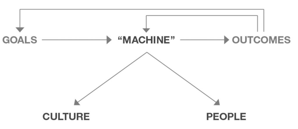 L’objectif à gauche conditionne le type de machine (i.e. : système) à mettre en place pour atteindre l’issue désirée (outcome à droite). La machine/système en elle même repose sur 2 choses : la culture (la vôtre ou celle de votre entreprise), et les gens (mettre les bonnes personnes aux bons endroits).
