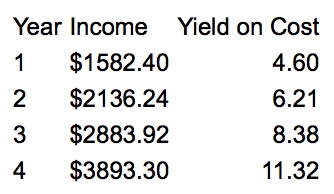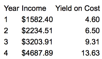 Concrètement le rendement de 4.60% l’année 1 de votre investissement serait devenu un rendement de 11.3% l’année 4. Et cette simulation ne prend pas en compte un facteur important : la possibilité de réinvestir vos dividendes pour avoir plus de titres chaque trimestre (car vous pouvez soit encaisser vos dividendes en cash soit décider de les réinvestir).