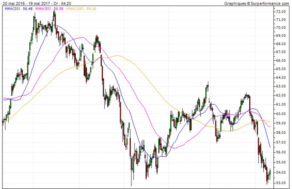 Quoiqu’il en soit, les corrections créent les opportunités pour les investisseurs malins et nous commençons à approcher de zones intéressantes sur ce titre. Le dernier mouvement de baisse a été particulièrement directionnel et violent avec une chute de 62 à 53 en quasi ligne droite ce qui dénote que les vendeurs ont pour le moment le dessus (à titre personnel je n’ai donc pas encore acheté mais comme dit plus haut je surveille le titre comme le lait sur le feu).