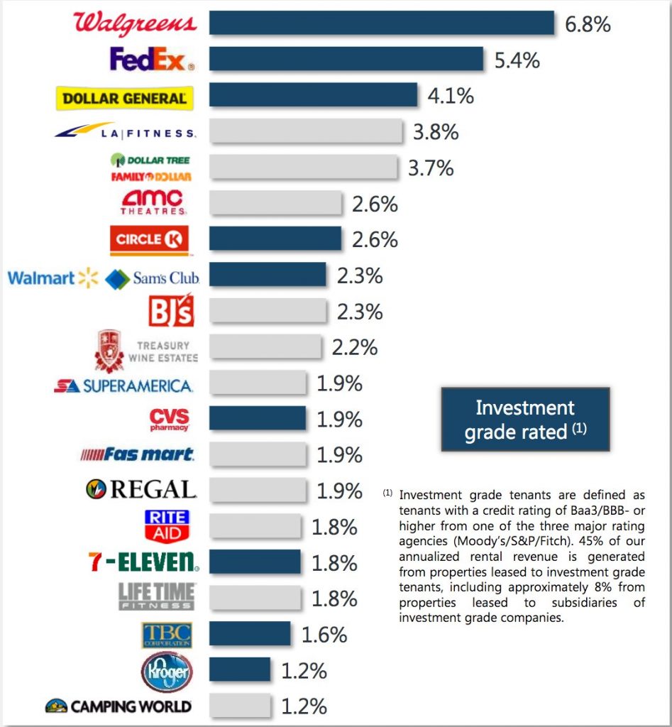 Le parc immobilier de Realty Income se compose de plus de 4900 propriétés réparties dans 50 états différents et louées à plus de 250 entreprises ; on peut donc dire qu’ils sont bien diversifiés. Realty income met également un point d’honneur à maintenir une grande diversification des types d’industries auxquels elle loue ses locaux (cela va du centre de fitness au centre commercial, en passant par les restaurants, les vendeurs de voiture, les cinémas et les pharmacies).