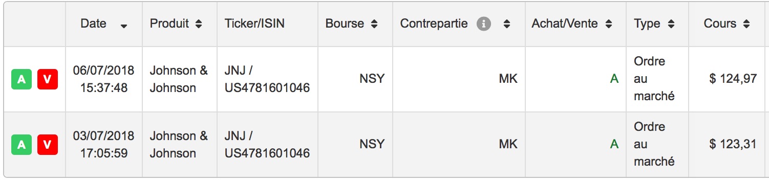Comme vous le savez je suis mes propres conseils et voici (à titre indicatif) mes tickets de transaction sur l’action Johnson & Johnson (mentionnant entre autres le prix et la date d’achat) :