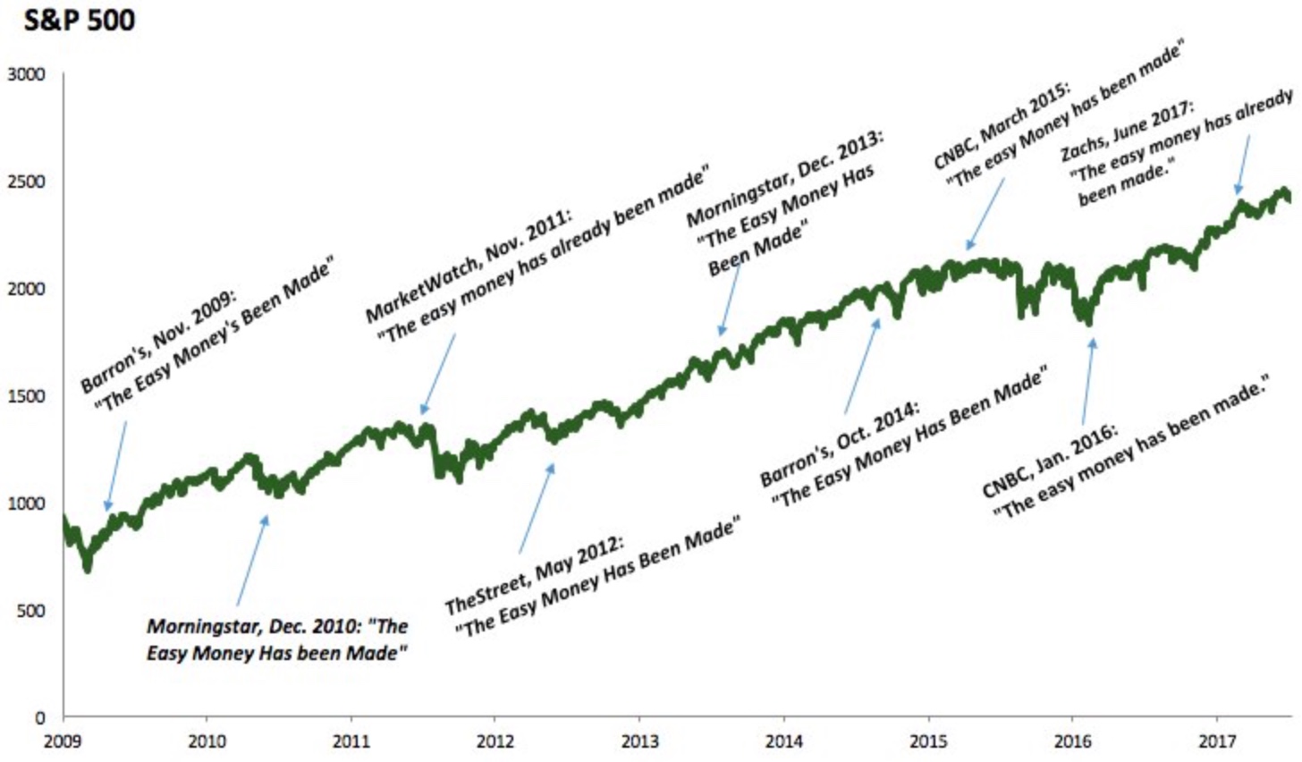 Voici maintenant un graphique intéressant qui retrace toutes les périodes où la presse financière a publié que « la période d’argent facile était terminée » (aussi surnommé le « Easy money has been made chart« ) :