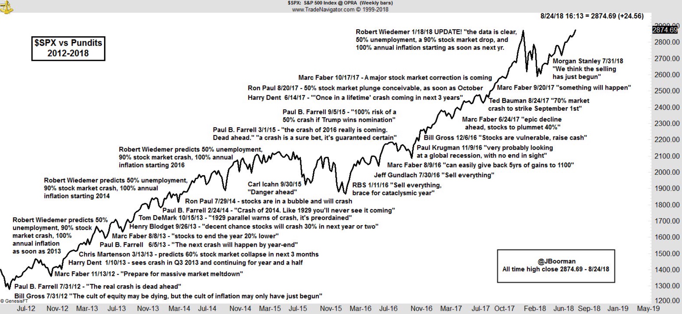 Vous l’aurez compris : il s’agit d’un graphique du cours de la bourse américaine anoté d’une liste (non exhaustive) des prévisions boursières catastrophistes parues dans la presse financière sur la même période.
