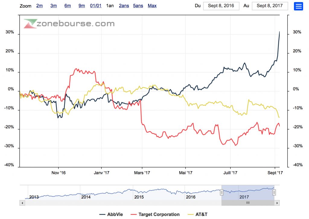 Les 3 titres ont le statut d’aristocrate et ont augmenté leurs dividendes depuis plus de 25 ans, mais là où un investissement dans Abbvie a rapporté 36% en quelques mois, un investissement dans Target aurait débouché sur une perte de 20%.
