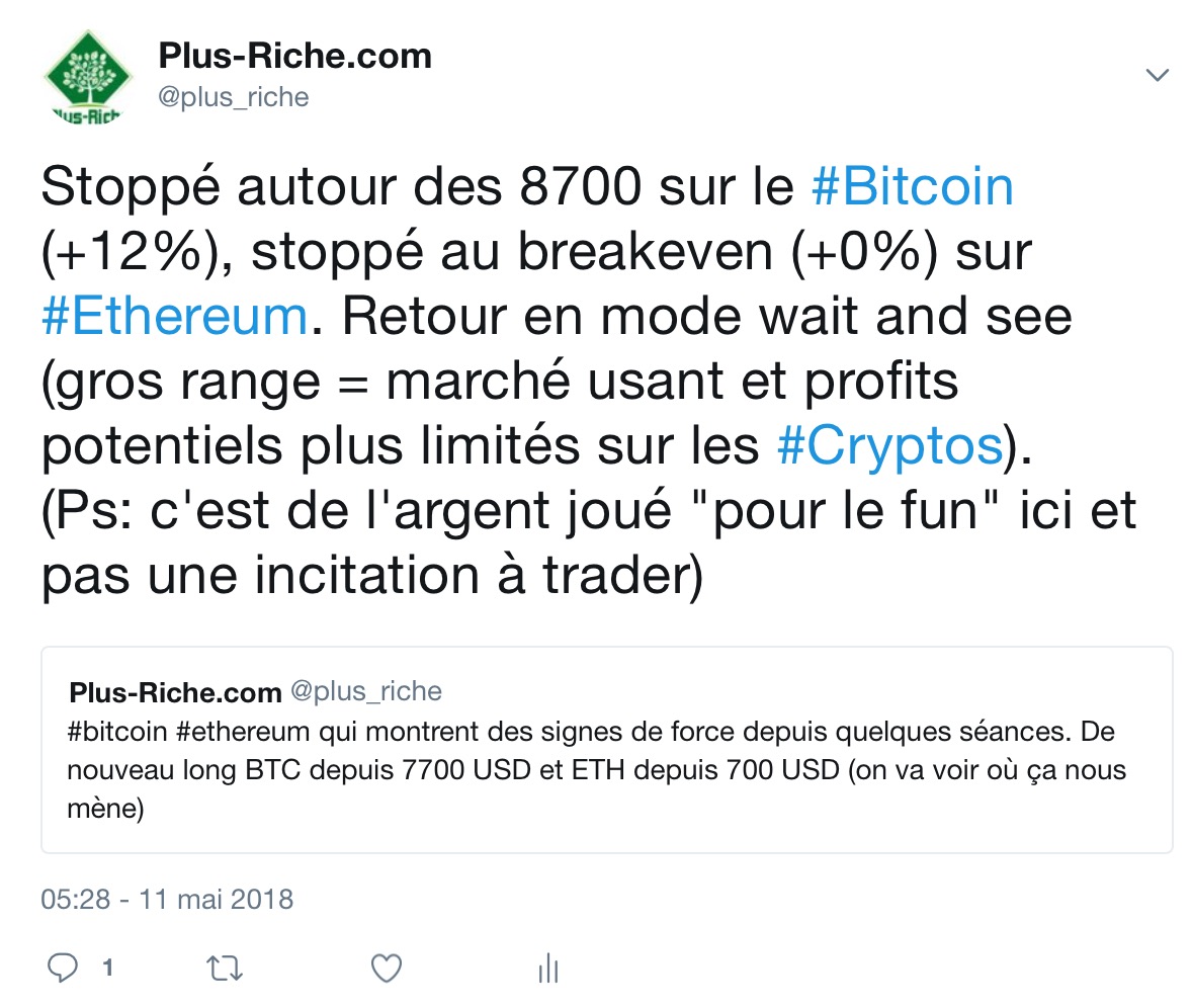 Ceux qui me suivent sur Twitter ou Facebook ont peut être noté que j’ai retenté brièvement une position longue fin avril/début mai (la tentation du trading étant toujours très forte, même pour moi sur ce genre d’actifs), qui a débouché sur de faibles gains (+12%) et qui a été revendue rapidement, et une position sur l’ETH qui a fini autour du zéro :